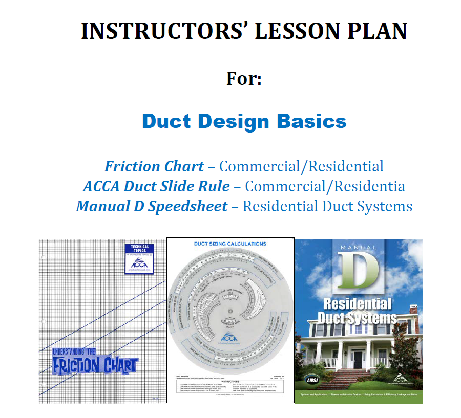 To assist in teaching ACCA Manuals, ACCA has created a number of free lesson plan documents designed to facilitate teaching. The lesson plans are intended for use by HVAC instructors at vocational schools and community colleges as a method of introducing their students to industry-accepted procedures for HVAC system design described in the code-cited ACCA design manuals.