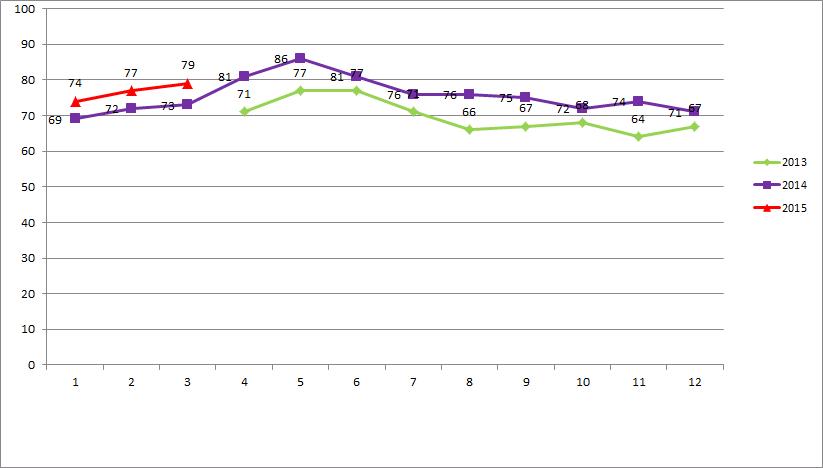 For March 2015, the CCI is 79. The CCI also shows that contractors are feeling better than they were 12 months earlier when the CCI was 73.